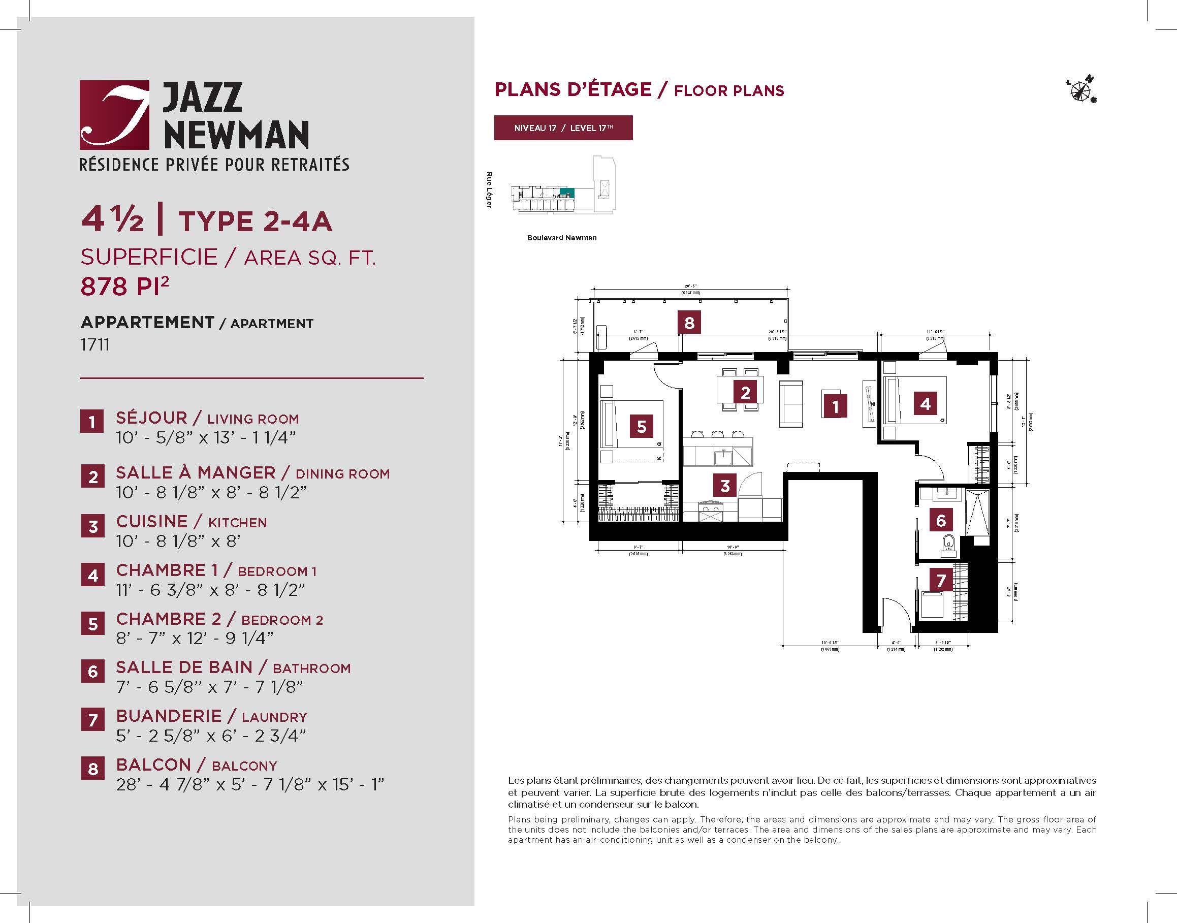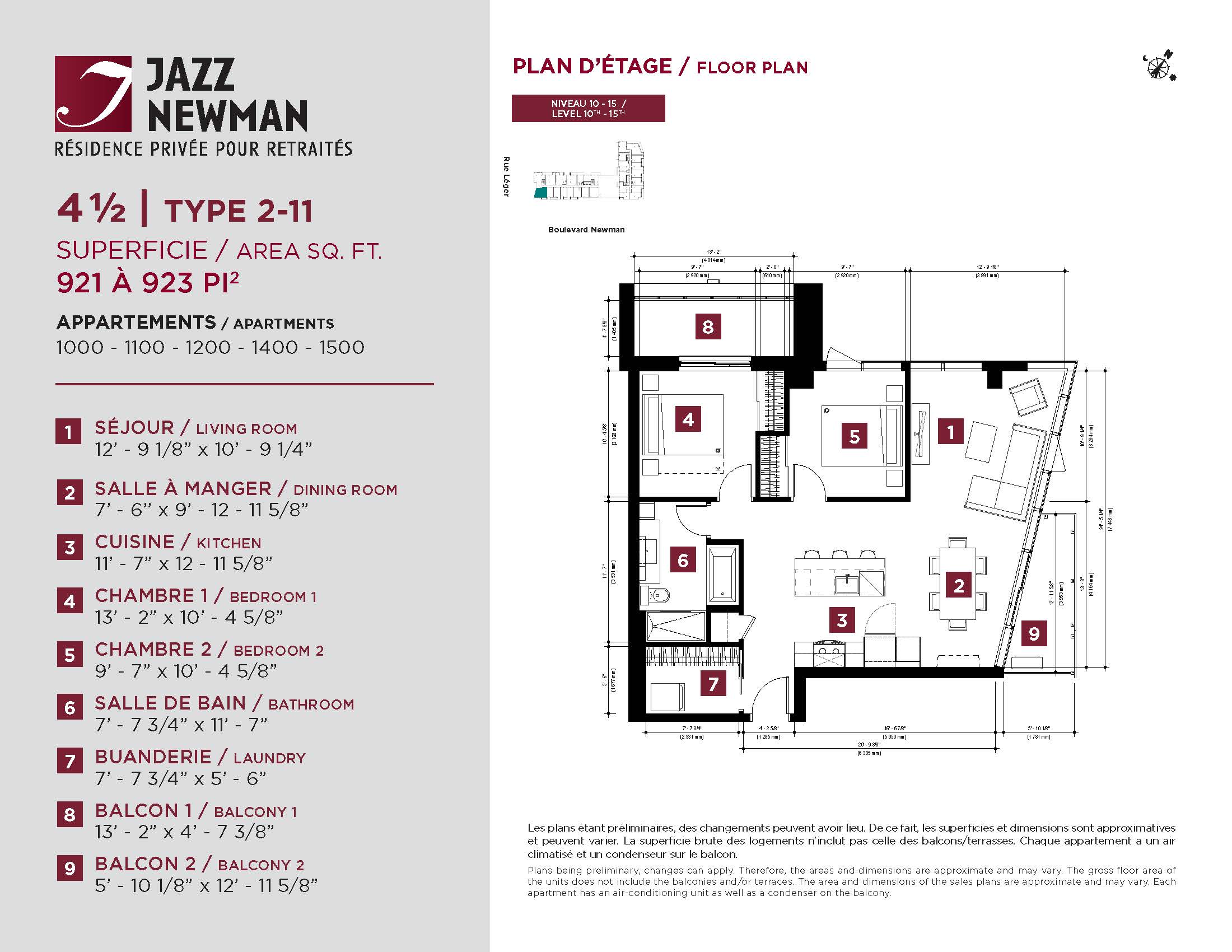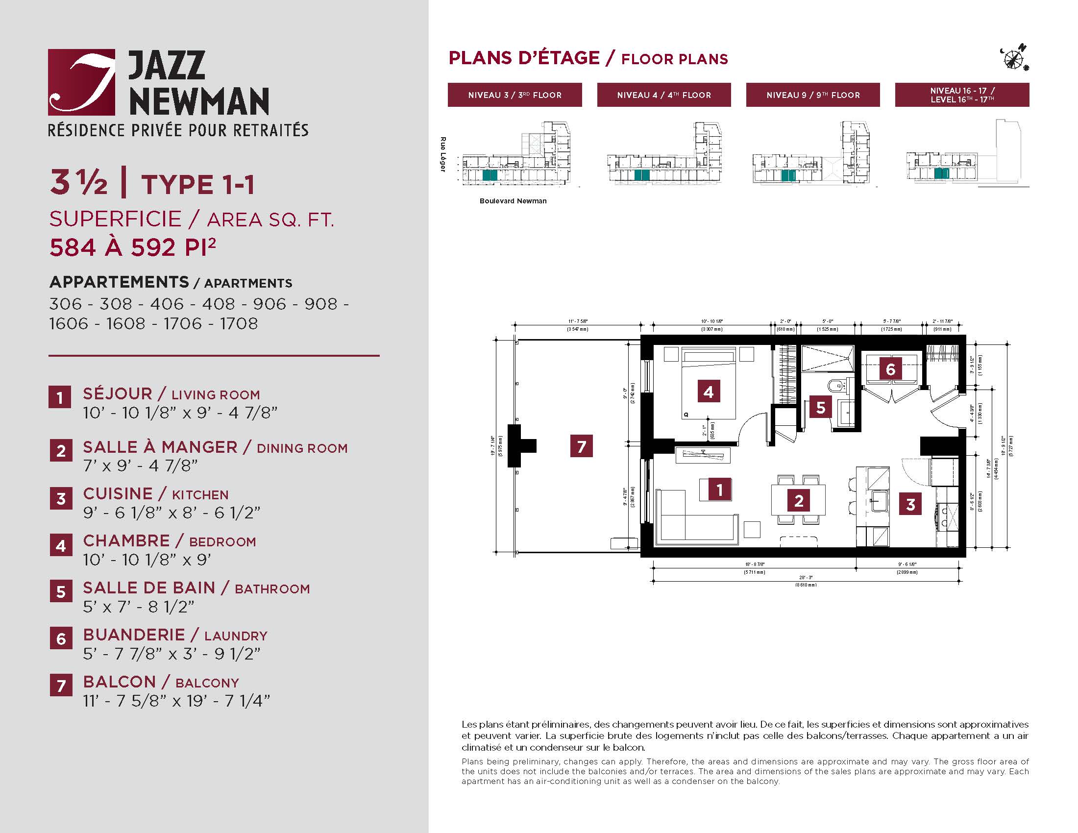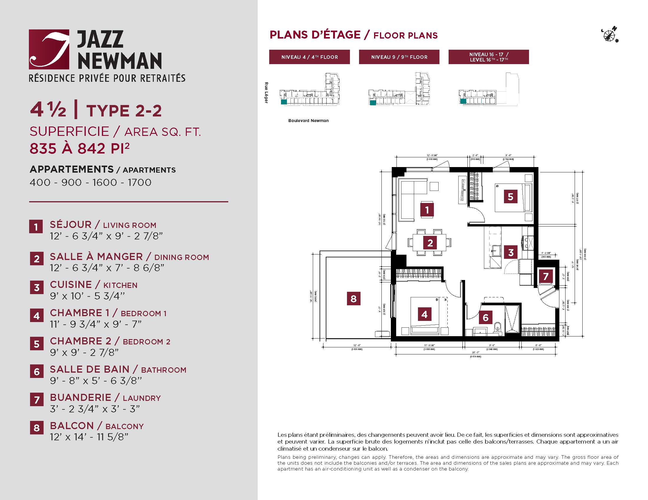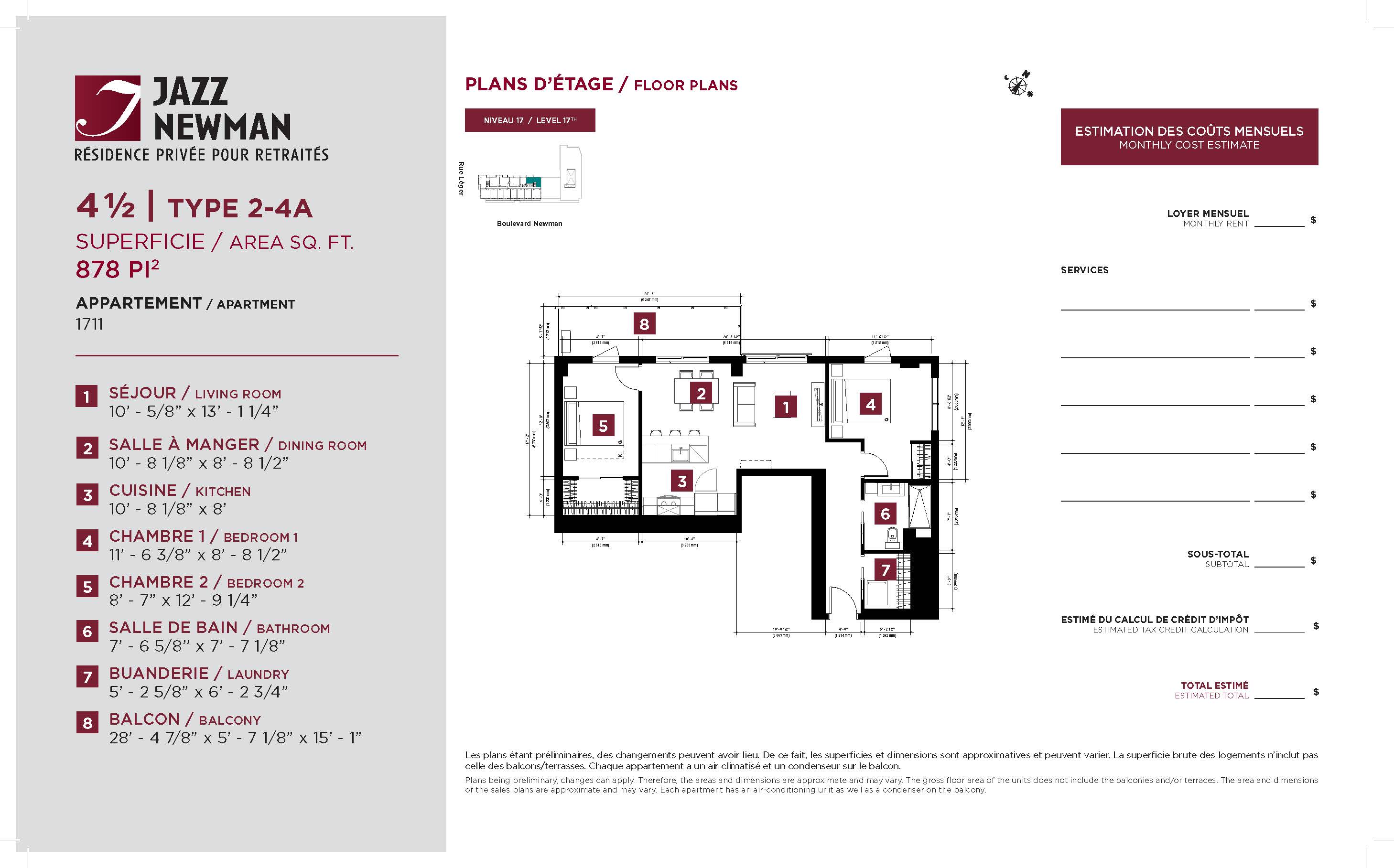* Availability of apartments to be confirmed with your rental advisor. Care units available. Prices may be subject to change without notice. Apartments eligible for the tax credit for home support offered by Revenu Québec. Additional charges apply to certain apartments, where the addition of services is mandatory.