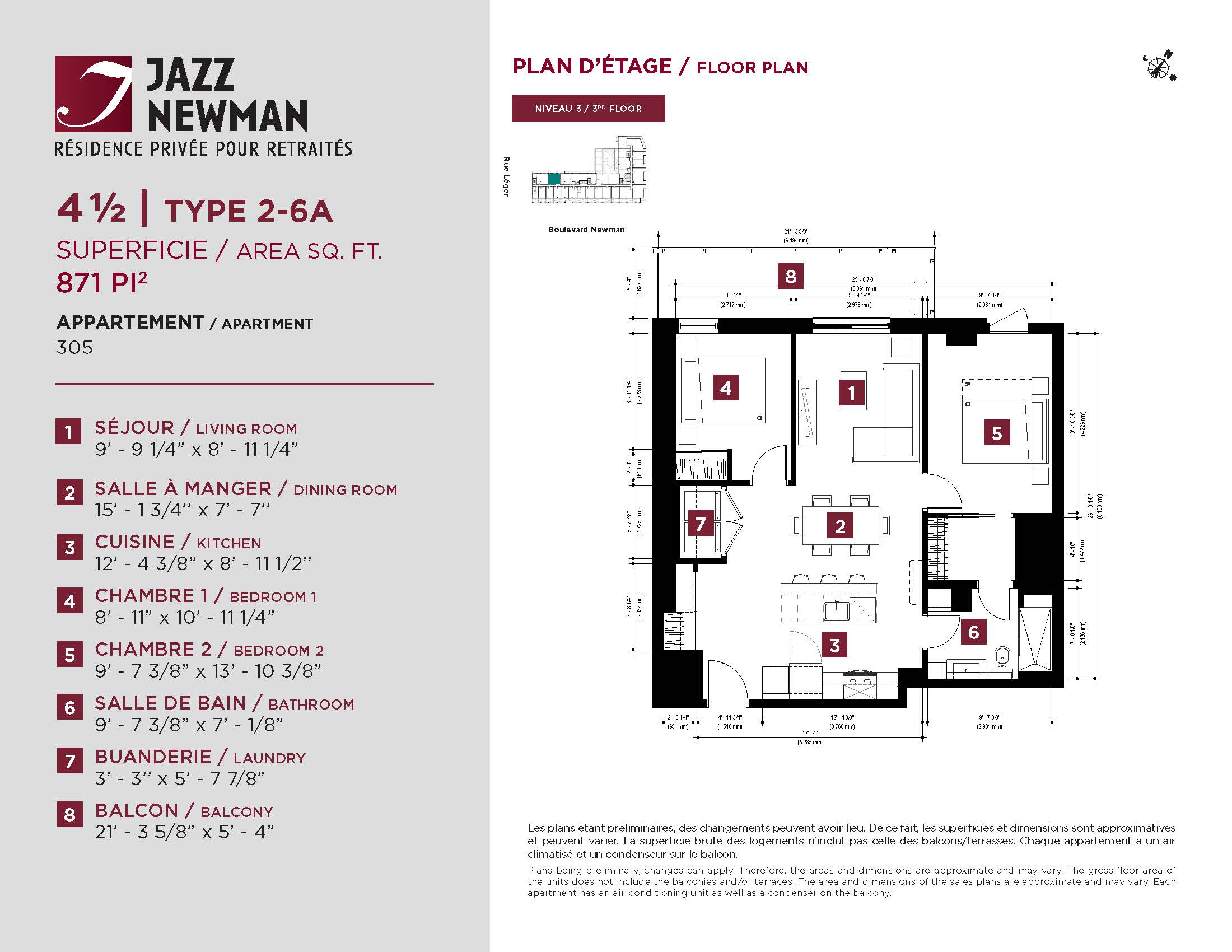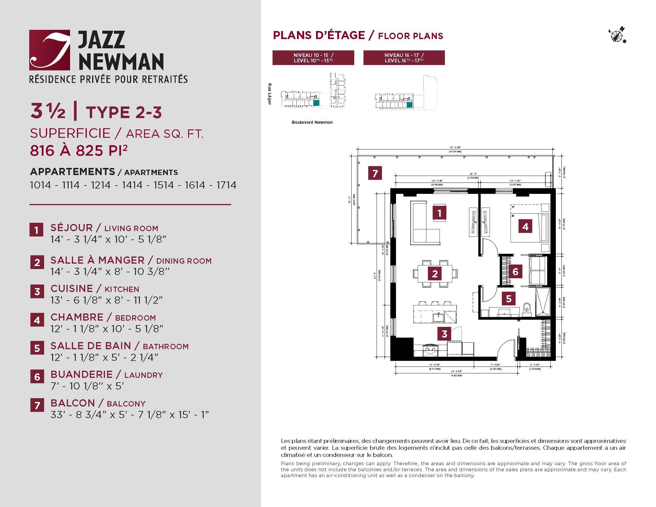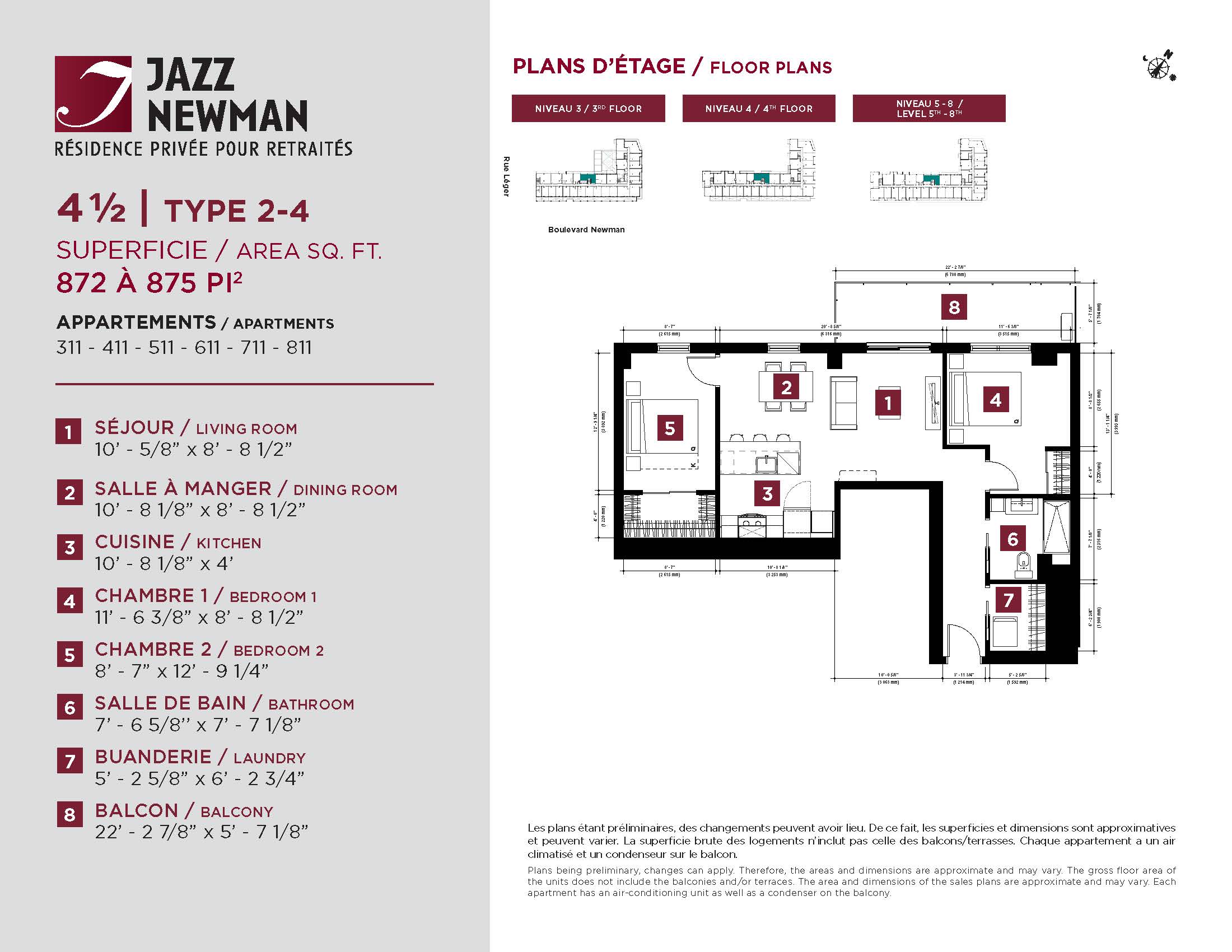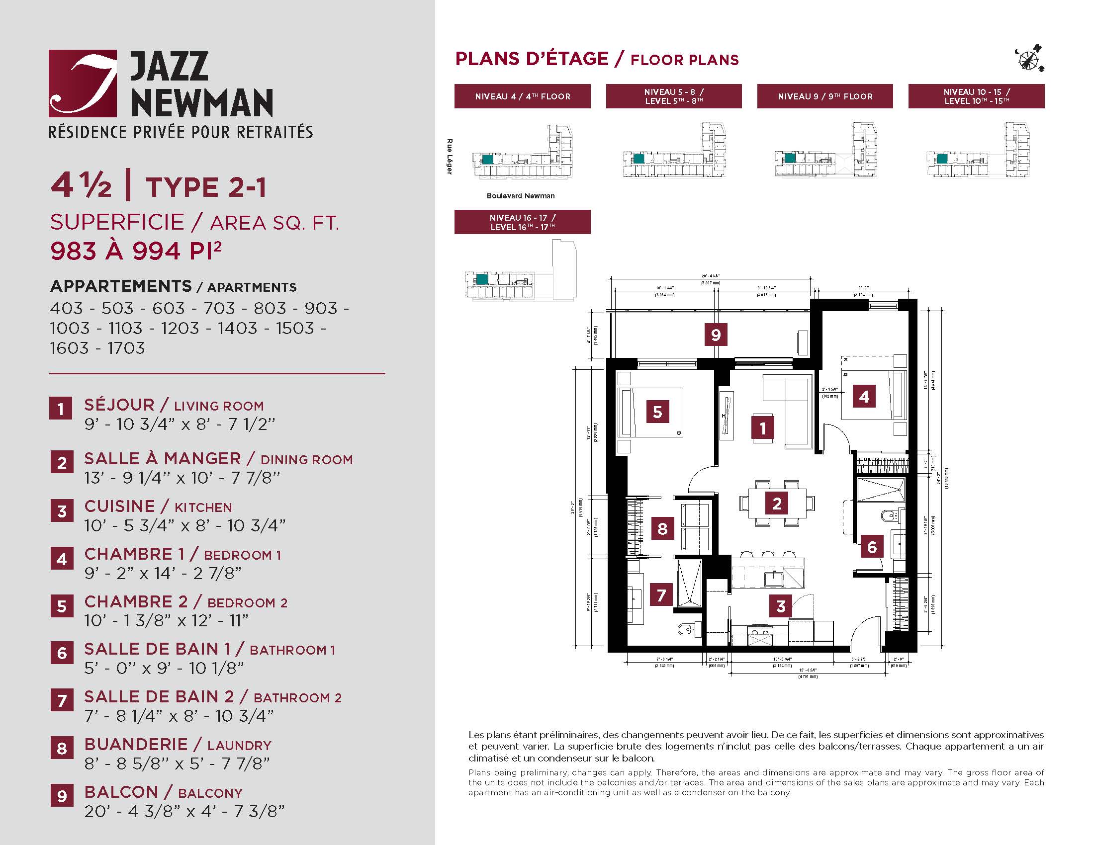 * Availability of apartments to be confirmed with your rental advisor. Care units available. Prices may be subject to change without notice. Apartments eligible for the tax credit for home support offered by Revenu Québec. Additional charges apply to certain apartments, where the addition of services is mandatory.